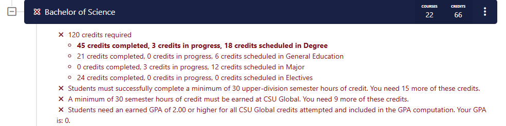 At the very top of your full audit, you will see a summary of your program's "big picture" requirements. This includes your total credit count, your GPA (which must be 2.0 or higher), and specific residency requirements (credits that must be earned specifically at CSU Global).