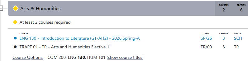 In General Education, the audit often lists many "Course Options." You do not need to take every class listed. You only need to fulfill the specific number of credits required for that section (e.g., "At least 2 courses required").