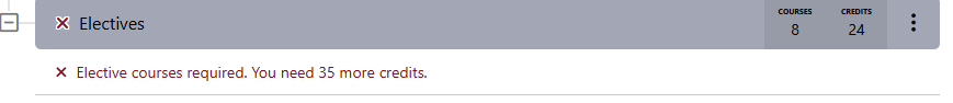 The Electives section shows the total number of elective credits you still need to reach 120. Unlike your Major requirements, you have the freedom to pick any college-level courses that interest you to fill these slots.