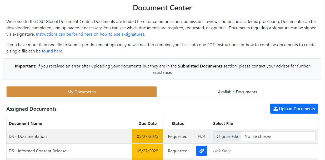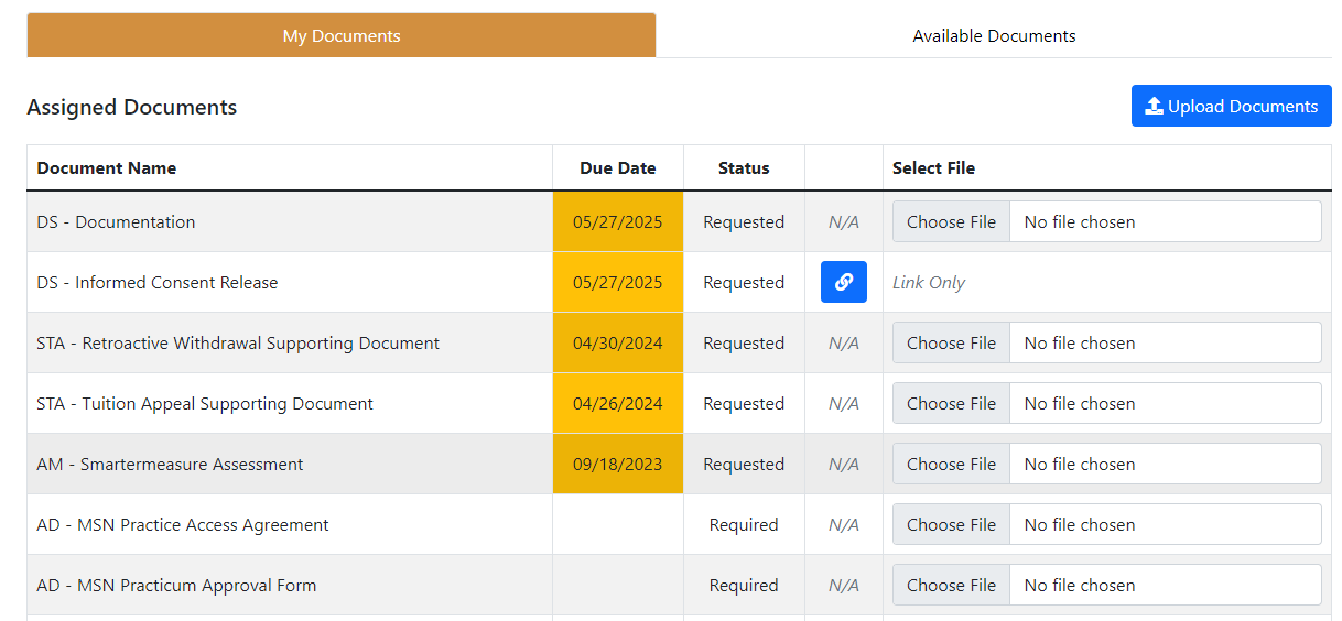 “My Documents” are forms that have been assigned to you or links to required items, such as the FAFSA application (for financial aid students). You can view the “Status” column to determine if the form/document is “required” or “requested”.